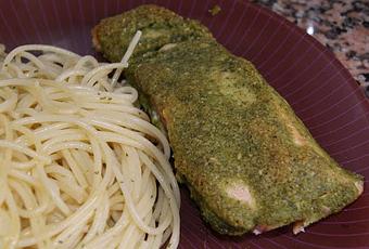 Sacamos con cuidado los lomos de salmón y los servimos acompañados de un poco de pasta, por ejemplo salteada con ajo y albahaca. ¡Fácil y buenísimo!
