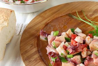 1 cebolleta, 1 pimiento verde, 1/2 pimiento rojo, 1 tomate, 12 langostinos, 1 pata de pulpo cocido en su jugo de O'Percebeiro, y para el aliño, 50 ml de vuestro mejor aceite de oliva virgen extra, 10 ml de vinagre de Jerez y 50 ml del caldo de la cocción del pulpo, y unas hojitas de perejil fresco