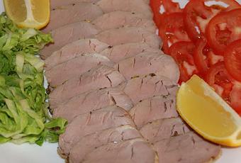 Cuando la carne esté fría la cortamos en lonchas lo más finas que podamos. Si tenemos una cortadora de fiambre, mucho mejor, aunque con un buen cuchillo también podemos conseguir una lonchas perfectas.