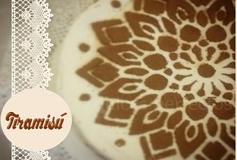 Bizcocho de Vainillas3 huevos100gr de azúcar125gr de harina común (0000 sin agente leudante)30cc de leche1 cucharadita de esc. de vainillaPara humedecer: Coñac, cacao y café instantáneo (o un buen café de maquina)Crema de Tiramisú2 huevos100gr de azúcar30cc de agua400gr Queso crema /Mascarpone 400gr Crema de leche 100gr Azúcar5gr de gelatina sin saborDecoración: Cacao amargo y estencil