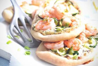 Colócalas en 2 bandejas cubiertas con papel de hornear y úntales por encima una capa fina de nata agria con finas hierbas. Cúbrela con la mezcla de cebolletas, las rodajas de calabacín y las gambas y echa pimienta por encima.