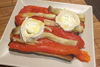 Pelamos y apartamos las pepitas y dejamos la verdura preparada. Ya casi tenemos el plato listo. Solo nos falta tostar el pan y, opcionalmente, untarlo con tomate. Colocamos el pimiento y la berenjena sobre el pan y rematamos con el queso de cabra.