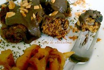Espolvoreamos un poquito de perejil por el plato, colocamos en el centro una ración de 6 ó 7 albóndigas, regamos con la salsa de morcilla, ponemos un poquito de guarnición de cebollita y manzana y añadimos por encima las almendras picadas (no tenía piñones ;-))