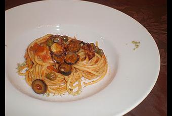 Ingredientes (2p): 110grs de spaghetti, 3 dientes de ajo, media lata de anchoas en conserva, guindilla seca, aceitunas negras, 2 cucharadas de alcaparras, 300grs de tomate triturado, sal y aceite de oliva.