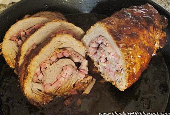 ¿Qué necesitamos?- Pieza de falda de ternera (1kg aproximadamente)- Tarrina de cintas de beacon- Jamón serrano- Ajo en polvo- Sal- Opcional a gusto de los comensales: champiñones (previamente salteados en la sartén con ajo y perejil), pimientos u otras hortalizas (también salteadas), jamón dulce, queso, pasas...Para la salsa:- Aceite- 3 dientes de ajo- 2 cebollas- Vino tinto- Sal- Opcional: pasas, piñones, pimientos, berenjena, etcPasos a seguir: