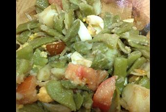 Comenzamos pelando las patatas. En una olla echamos a hervir las patatas partidas en cuadrados, los huevos, y las judías verdes. Luego, cuando todo este listo, los escurrimos. Picamos las cebollas en lascas y el tomate, una vez lavado, en medias rodajas. Mezclamos todo bien, con aceite de oliva virgen extra, vinagre y sal a gusto. Podemos añadir una lata de atún para una comida completa.