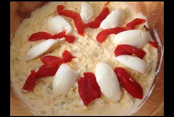 Decoramos con un huevo partido y pimientos morrones como en la foto y guardamos en la nevera para servirla fría.