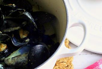 Si algún mejillón no se abre, ¡¡a la basura!!, no merece la pena forzar su apertura con un cuchillo por el riesgo de intoxicación. Cuando hayamos sacado todos los mejillones del agua, retiramos el laurel y reservamos ese agua donde han cocido para abrirse para más adelante. En una cacerola que además nos sirva para llevarlos a la mesa continuaremos con el proceso. Yo he usado mi cocotte blanca de LeCreuset para esta parte. Además tiene la ventaja de que conserva muy bien el calor por lo que puedo llevarla a la mesa y mantiene este plato en su temperatura, hasta que todos se sientan a comer.