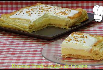 El hojaldre tiene que ser en láminas finas de medio centímetro de grosor, y da igual que sean redondas o cuadradas, lo puedes hacer de cualquier forma. En la receta también te indico como hacer la crema pastelera y como montar la nata, así que podrás preparar una tarta muy buena y tradicional en un momento.