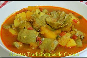 La elaboración es muy simple, como cualquier otro guiso, lo único que tienes que tener en cuenta es que para darle mas sabor se utiliza caldo de aves, pero puedes usar el que tu quieras, como de ave, de carne suave o concentrado diluido en agua, el resto de caldo que necesitas es agua. Otra cosa importante es que la calabaza y las patatas necesitan mas tiempo de cocción que las alcachofas, por lo que tendrás que ponerlas a cocer unos 15 minutos antes, luego añades las alcachofas y lo dejas cocinar todo junto otros 18 minutos más.