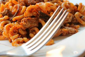- Cuando la carne empiece a estar doradita añadir los fideos y rehogarlos bien. Es importante que la carne no esté complemente hecha porque si no os iba a quedar muy seca al final.
