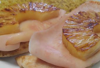 En la sartén, ponemos un pelín de AOVE, y acto seguido la rodaja de piña, a la que deberemos dar las vueltas necesarias hasta que tenga un bonito color dorado. La cortamos por la mitad, y colocamos cada uno de los trozos encima de cada uno de los dos filetes de pechuga pavo.