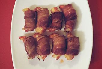 No tienen ningún misterio pelar las gambas, langostinos o gambones crudos, lo que más os guste y envolver con bacon. Meter en el horno a unos 200 grados unos 10 o 15 minutos aproximadamente por cada lado hasta que el bacon este doradito al gusto.