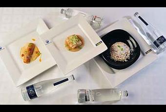 Disponer la espuma de castañas en la base del plato, la pescadilla envuelta en el carpaccio de hongos encima y terminar con los tallarines de calamar al ajillo y la salicornia.