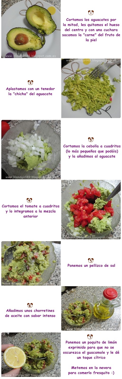 Hola corazoncetes ¿qué tal os fue ayer? me imagino que la mayoría tuvisteis el día libre :) ¿qué hicisteis? yo tuve a la pareja de mi madre como invitado a comer a casa que hacía tiempo que no pasaba tantas horas con ellos. La comida fue genial y también estuve planeando un poquito más los cumples^^ ya sé que tartas voy a preparar y también los regalitos! Si todo va bien la semana que viene ya los habré comprado :)Hoy os traigo una recetita riquísima, muy fácil de hacer y fresquita para picar en verano :), se trata del Guacamole. Es una receta que seguro podréis encontrar muchas variantes diferentes por internet, pero yo quiero compartir mi manera de hacerla para quienes la queráis probar. Sin duda merece la pena perder 10 minutitos en prepararla porque está riquísima :DEn casa nos encanta comerlo por la noche que no apetece ponerse a preparar comidas más elaboradas, además es una receta que, gracias al aguacate, contiene muchos aceites vegetales y es muy nutritiva aunque tampoco hay que pasarse el día comiendo lo mismo ya que es una de las frutas más calóricas y con contenido graso, pero en cantidades moderadas aporta beneficios a nuestro organismo además de bastantes vitaminas, ácidos grasos, minerales y proteínas. Esta receta tiene un truquito que yo diría que es el más importante para que quede bueno el Guacamole, sino posiblemente no os gustará nada de nada, así que atentas: el aguacate tiene que estar bien madurito. Para las que no sepáis cómo saberlo os lo cuento ya que hay varias formas de conseguir que estén en su punto: una de las maneras es que cuando vayamos al supermercado vayamos tocando los aguacates, tenemos que tocar los que estén más negritos y si se os hunden un poco los dedos ¡no dudéis en cogerlos! pero tampoco cojáis los que veáis que parecen blandiblu por dentro que esos posiblemente estén para tirar a la basura. Otra manera es coger unos cuantos todavía verdes y tenerlos en casa en un lugar seco hasta que maduren, a mi normalmente me tardan unos 7 días... pero lo suyo es irlos tocando cada día hasta que veamos que están oscuritos y se nos hunden los deditos :) ¿Qué ingredientes necesitamos?- 2 aguacates- 1 tomate (a mi personalmente me encantan los que son tipo pera)- 1 cebolla medianita tirando a pequeña- el jugo de medio limón- unos chorritos de aceite sabor intenso- sal- Los nachos para remojarlos en el guacamole :PPreparación paso a paso: ¿Fácil verdad? Os aseguro que como mucho se tarda 10 minutos para prepararlo y luego hay que dejarlo en el frigorífico al menos una media horita para que esté fresquito^^ Mmmmm, ha sido publicaros la entrada y me han dado unas ganas tremendas de comer un poquito jajaja es una pena que no tengo aguacates en casa T_T pero en cuanto pase por el mercadona me cojo unos cuantos :PY, hablando del Mercadona, hay un preparado de guacamole que no está nada mal, lo tienen refrigerado por dónde están las lechugas aunque está todo triturado y creo que no lleva tomate. Yo lo he probado y tiene buen sabor (aunque yo cuando lo probé le añadí tomate) pero sinceramente me gusta más el que preparo en casa, encuentro que tiene mejor sabor, pero quería comentarlo por si alguna quiere probar el casero y el comprado^^¿Qué os ha parecido la receta? ¿habéis probado el guacamole? ¿os gusta?Un besote enormee ¡feliz jueves!