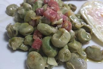 Las habas verdes no son muy conocidas en León, en otras zonas del norte no lo se, pero aquí no las he encontrado frescas en níngún sitio. Pero en Andalucía son muy típicas. Concretamente en Granada (cuando es temporada) aparte de como las voy a preparar hoy se suelen comer en fiestas como el día del patrón de Granada (San Cecilio), y se comen crudas y acompañadas de salaillas, un pan también típico cuyos ingredientes estrella son el aceite de oliva y la sal gorda, y cuya receta compartí no hace mucho y la podeis ver aquí.