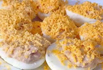 Una vez tengamos los huevos rellenos , rallamos las dos mitades de yema que habíamos reservado por encima.