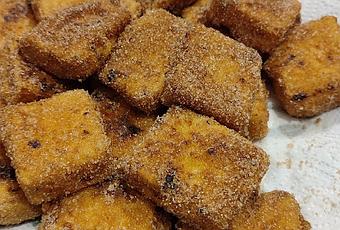 Pasamos los trozos por harina, luego por huevo, y con cuidado, a la sartén, donde les daremos un par de vueltas hasta que estén dorados, momento en el que los sacaremos a un plato con un papel absorbente. Cuando hayan reposado unos minutos, pero todavía calientes, las pasamos por la mezcla del azúcar y la canela, y los colocamos en otro plato con papel absorbente.