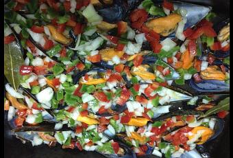Aparte picamos la cebolla y los pimientos en pequeños pedacitos. En un recipiente echamos los vegetales picados y le agregamos sal, aceite y vinagre a gusto. Una vez lo tenemos todo bien mezclado lo echamos por encima de los mejillones. Lo ponemos unos minutos en la nevera antes de servir para que estén fríos.
