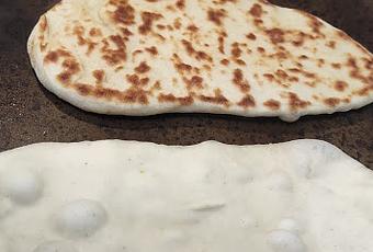 Poner sartén o plancha a fuego fuerte, pintar con ghee, y colocar el pan. Dejar un minuto o dos, hasta que empiecen a verse burbujas, momento en el que le damos la vuelta y pintamos con ghee. Dar la vuelta al minuto o así, cuando el pan empiece a verse con círculos negros, y volver a pintar de ghee, y a un sitio donde lo podamos tapar ya sea con un paño limpio o con film.