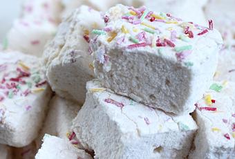 NO son como las nubes blancas que compras en bolsas en algunas tiendas especializadas, que también son deliciosas. Estas nubes tienen un sabor más intenso de vainilla, y una textura más sedosa. Y las puedes decorar a gusto, añadir otros sabores, ¡incluso teñirlos para que hagan juego con la decoración de la fiesta! Si tienes una batidora eléctrica (amo a mi KitchenAid), no son difíciles. También necesitarás un termómetro para repostería, y una bandeja rectangular o cuadrado. Y como ingredientes especiales, necesitas gelatina en polvo o en láminas, y jarabe de maíz, o “corn syrup”, que puedes comprar en algunas tiendas de comida extranjera o de repostería (yo compro el mío en Sabores del Mundo o en la tienda de Megasilvita).