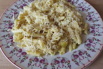 Ingredients: pasta (macaroni, spaguetti...), approximately 80 gr. per person 1 zucchini 1/2 onion evaporated milk Emmental cheese salt and curry