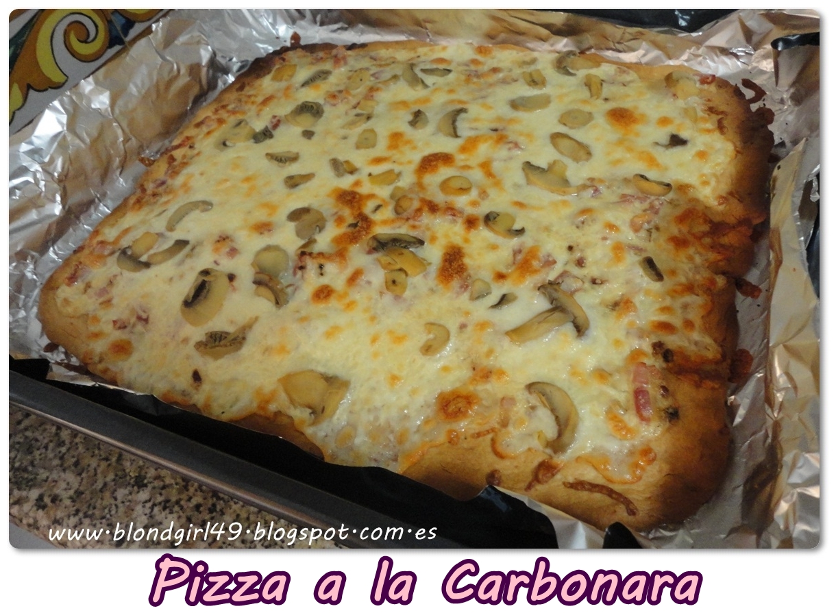 Hola preciosidades ¿qué tal estáis? espero que requetebién y a las que estéis de exámenes mucho ánimo sé que es duro pero luego merece la pena (no en el sentido laboral porque las cosas están muy mal, pero sí como logro personal^^), yo me encuentro mucho mejor, ayer estuve con fiebre pero a medida que fue pasando el día se me pasó junto con el dolor así que ya estoy bien para seguir dando guerra^^ y poco a poco me estoy poniendo un poquito más al día con los blogs que ya era hora! Por cierto, la semana pasada os mencioné que quería probar a preparar macarons... pues los he hecho (quería hacerlos para darle una sorpresa a mi chico^^) pero más que macarons parecen galletitas crujidas de color azul tostado, ni que hubieran ido a tomar el sol ¬¬ están buenas pero no me han quedado como tocaba así que seguiré probando para contaros todos los trucos que pueda el día que os prepare una entrada con la receta :) También quería recordar que hice una entrada de las diferentes masas que hago para las pizzas, las hay para todos los gustos: crujientes, esponjosas, delgadas, más gorditas, etc. Podéis ver la entrada de "masas e ideas para pizzas" aquí. En este caso, yo para esta pizza usé la masa crujiente (al estilo mallorquín) que queda estupenda y en casa nos gusta mucho :)INGREDIENTES DE LA CARBONARA: (pensad que yo hice una bandeja de horno grande y por eso uso tanto ingrediente)- Aceite para cocinar- 2 cebollas medianitas- Cintas de beacon (una bandejita)- Chopped (usé la mitad de la tarrina, también podéis optar por jamón serrano o york que también he usado en otras ocasiones y quedan muy bien)- Nata (al final usé 300ml)- Ajo en polvo- Sal- 1 huevo- Tomate frito (opcional, yo al final no lo usé)- Champiñones laminadosPROCEDIMIENTO: 0. Antes de empezar deberemos preparar la masa y meterla en el horno para que se vaya cocinando.1. Pochamos la cebolla en la sartén, la cortamos pequeñita y la dejamos con un buen chorrito de aceite y le ponemos sal para que se caramelice más rápido2. Mientras se pocha la cebolla vamos preparando la nata: ponemos en un bol la nata con el huevo y mezclamos bien3. Cortamos los chopped a trocitos y lo juntamos con el beacon4. Cuando tenemos la cebolla pochadita le añadimos el chopped y beacon5. Una vez que tenemos bien cocinado todo le quitaremos el exceso de aceite+agua que queda en el fondo de la sartén6. Cuando ya esté a temperatura ambiente el salteado le podremos poner la nata con el huevo integrado (es importante que no esté caliente sino se os cocinará la mezcla!!) y le añadiremos el ajo en polvo, sed generosos que le da un toque muy bueno 7. Una vez tengamos la masa ya preparada la sacaremos del horno y podremos ponerle por encima la carbonara, si habéis hecho los lados más elevados mejor porque así evitaréis que se os salga (yo no lo hice y tuve que apañármelas con el queso para atrapar la salsa xD)8. Añadimos el queso estratégicamente para que no haya nata fuera de la pizza, también añadimos los champiñones y meteremos en el horno hasta que veamos que el queso empieza a gratinar y si os gusta muy hecha mejor esperar más (yo la saqué a mi gusto)9. Pizza recién sacada del horno, quedó en su punto y la nata al llevar el huevo cuajó así que al cortarla no cae la nata :)¡LISTA PARA COMER! Está riquísima esta pizza, si todavía no la habéis probado intentad hacerla en casa porque de verdad que merece la pena^^En las siguientes fotos podéis ver como la nata queda cuajada gracias al huevo, al cortarla no cae la nata por los lados, es como preparar un quiche pero al estilo pizza :P Una en grande para que dé la sensación de que os llega el aroma y todo :P ¿Qué os ha parecido la pizza? ¿habéis probado a la carbonara? ¿y en casa habéis hecho?Un besote enorme ¡feliz jueves!