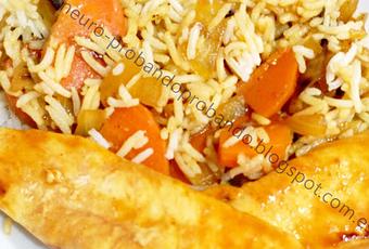 1. Lo primero que tenemos que hacer es meter en una fuente la carne sin hacer junto con 4 cucharadas de salsa barbacoa. Removemos para que toda la carne se impregne de la salsa, tapamos la fuente y la dejamos en la nevera entre media hora y una hora.2. Hervimos el arroz basmati en una cazuela con agua. Acordaros de tirar el arroz dentro cuando el agua esté hirviendo, pues si lo hacéis antes se os quedará una pasta incomible (esta norma se aplica a todos los arroces). Cuando esté hervido, lo escurrimos.3. Mientras tanto, preparamos las verduras. Cortamos la cebolla, la zanahoria y el calabacín. Yo corto la cebolla y la zanahoria en trocitos pequeñitos y el calabacín en rodajas. Pero esto depende de gustos. La zanahoria la pelo, el calabacín no. También cuestión de gustos.