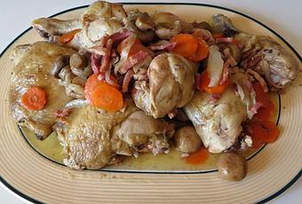Ingredients: chicken 1 onion 1 carrot 1 can of mushrooms 2 slices of bacon a cup of chicken stock a glass of red wine 2 spoonfuls of brandy 2 garlic cloves, bay leaves, salt and pepper