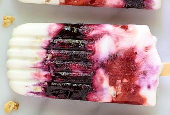 Organice los moldes para paletas. Ponga una cantidad generosa de yogurt en el fondo. añada una cucharadita de granola, después una cucharada de fruta (acomode de tal manera que no queden espacios). Continúe agregando capas de yogurt, granola y fruta hasta que se llene el molde. Inserte el palito de paleta. Congele hasta que este solida, 6 horas o toda la noche.