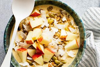 Ingredientes:1/2 taza Avena en Hojuelas Qikely1/4 taza leche de almendras o la de tu preferencia1/3 taza yogurt griego1 cucharadita sirope de maple1/2 cucharadita canela en polvo1/4 cucharadita extracto de vainillaPizca de cúrcuma (opcional)Jugo de limón 1 manzana, sin el centro y picada1 dátil sin semilla (opcional)Pizca de sal6 a 8 cubos de hieloToppings: semillas de calabaza, semillas de girasol, coco, manzana picada, sirope de maple