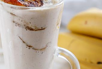 Sirva el smoothie en los vasos; agregue por encima el yogurt griego y las rodajas de banano.