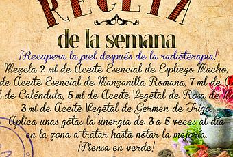 En la NUEVA RECETA DE ESTA SEMANA, nos gustaría volver al tema que ya tocamos este Lunes y compartir un protocolo muy natural para recuperar la piel y tratar las lesiones tras tratamiento de la radioterapia. A las personas que les hemos recomendado este protocolo, les ha ido muy bien, pues después de la radioterapia no han tenido lesión en la piel o ha sido insignificante.
