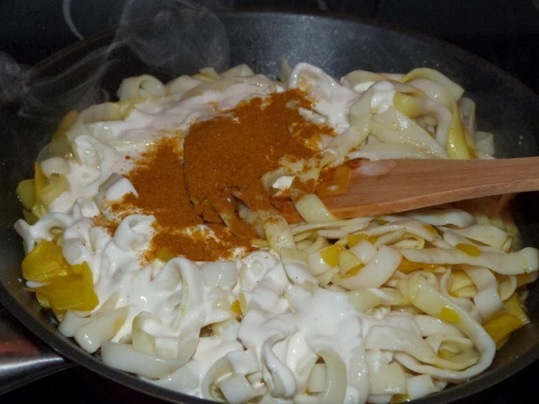 Para este receta he usado Tallarimis, que están genial como alternativa a la pasta, sin los hidratos de la misma, ya que como tiene base de surimi es casi todo proteína :) El sabor no es el mismo (claro está) pero os animo a que los probéis. ¡Y si queréis con la receta de hoy! Me encanta la pasta al curry así que me he hecho mi versión. Y me apetecía nata, así que como me he ahorrado puntos en la pasta pues me lo puedo permitir. ¡Allá va la receta!