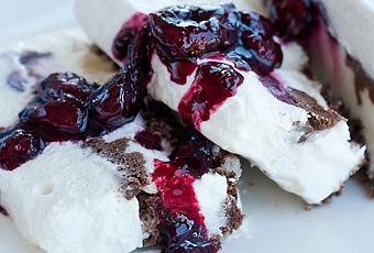- Cuando lo vayas a servir, mete el molde en agua caliente durante unos segundos. Vuelca el semifreddo en una fuente para que la base de galleta quede en la parte de abajo y deja a temperatura ambiente unos 15 minutos para que se suavice su textura. Decora con la salsa de cerezas y corta en porciones.