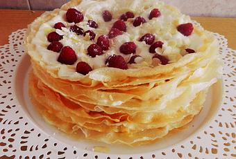 Una oblea,una capa de nata,oblea,capa de crema,oblea,nata...y para decorar la última capa,ponemos frambuesas y almendras laminadas.
