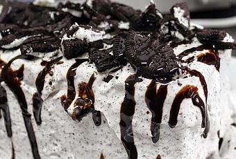 Podemos hacer la forma que queramos. Nosotros lo hicimos en 3 capas de 4 sándwiches cada una. Una capa de sándwiches y otra de crema. Al terminar lo que haremos será cubrirlo todo con más crema y decorarlo con trocitos de galletas Oreo. Como extra, le puedes echar tu sirope favorito, será una bomba. Lo dejaremos en el congelador por un par de horas para que se congele la crema.
