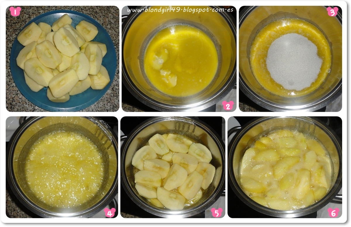 1. Pelamos, cortamos las manzanas y vamos descorazonando, yo suelo dejarlas en tamaño de cuartos,2. Ponemos la margarina al fuego para que se derrita, tenemos que usar un envase que podamos meter en el horno3. seguidamente añadiremos la sal y los azúcares e iremos removiendo con una cuchara de madera4. Tenemos que ir removiendo para que no se nos pegue el azúcar en la base de la cazuela, hasta que se nos forme el caramelo (aprox 10 min)5. Añadimos las manzanas, yo siempre las coloco con la parte redondeada boca abajo (aunque luego siempre se gira alguna ¬¬)6. Dejamos que las manzanas se vayan pochando y caramelizando, por lo menos otros 10-15 minutos. Si pasado este tiempo vemos que las manzanas han soltado mucho jugo podemos quitar líquido con una tacita (con cuidado de no quemarnos). Podemos encender el horno a 200ºC.