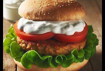Hamburguesa vegana con tomate, hojas verdes y una deliciosa salsa de yogur vegetal
