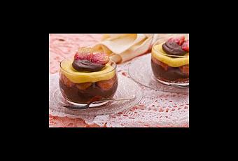 - Con una cuchara, coloca una capa de crema pastelera al chocolate encima de los bizcochos.