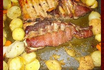 1 costillar de cerdo (entero)PatatasCebollasManzanasDos cucharadas soperas de mielUna cucharada sopera de mostaza ed DijonAgua (poca) Un chorrito de vino blancoHierbas provenzalesRomeroAceite, sal y pimienta