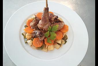*Con ésta receta obtenemos 346 KCAL distribuidas de la siguiente manera: 10 gr. Hidratos de Carbono, de los cuales 9.2 gr. Azúcares, 31.6gr de Proteínas, 20.1 gr de Grasas de las cuales 4.3 gr. SaturadasIngredientes para 2 personas:750 gr de conejo fresco½ cebolla½ Pimiento Verde150 gr de Tomate1 Diente de Ajo½ Zanahoria2 Papas1 Litro de caldo de conejo, carne o polloSal/Pimienta/tomillo/aceite