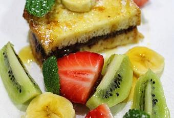 INGREDIENTES (2 pax)4 rebanadas de pan de molde u otro pan blanco mejor de los blandosNutella100 g. de mantequilla1 chorrito de aceite de girasol (para no quemar la mantequilla)FresasKiwisPlátanoGolden Syrup o Sirope de ArceAzúcar glass250 ml o un vaso de leche2 huevos1 cda. de azúcar1 pizca de azúcar avainillado o vainillina