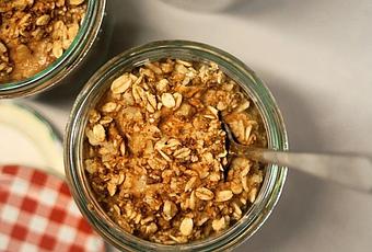En un frasco o recipiente preferiblemente de vidrio, coloca la avena y mézclala con el yogur. Si no tienes yogur, puedes usar espuma, leche, agua y hasta café (solo asegúrate de humedecer bien la avena). A continuación, agrega las nueces picadas y luego las rodajas de melocotón (puedes usar cualquier fruta que tengas, como plátano, arándanos o melón). Repite el proceso agregando más capas de avena, frutas y nueces hasta llenar el recipiente. Puedes endulzar con una cucharada de miel o sirope de agave. Lleva el frasco al frigorífico y déjalo reposar toda la noche. ¡Listo para disfrutar en la mañana! Esta receta da para un frasco de overnight grande.