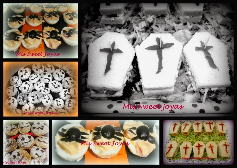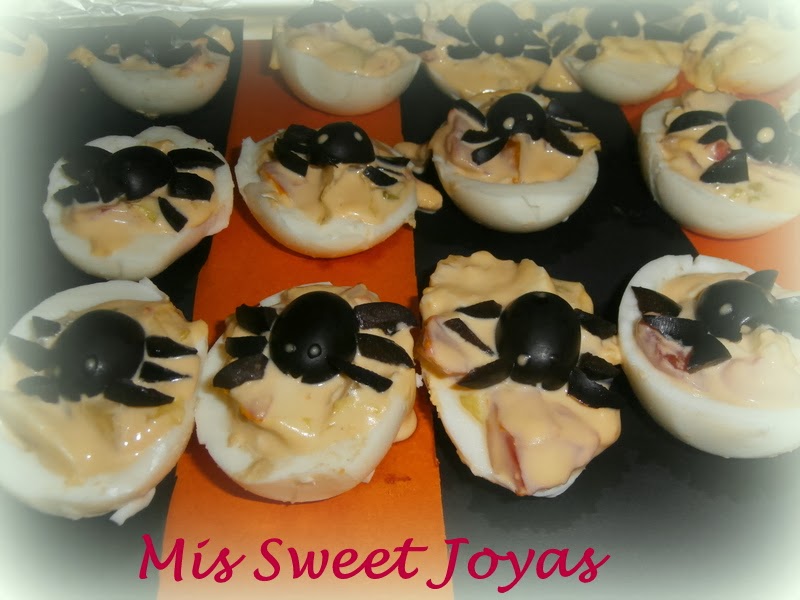 Huevos con arañas, tumbas con sandwich y Miguelitos hallowinianos" border="0" title="Recetas de Halloween --> Huevos con arañas, tumbas con sandwich y Miguelitos hallowinianos" /> Empezaré por los huevos con arañas. Es muy fácil hacerlos y cada uno puede hacer el relleno que quiera, para éstos necesitamos:Huevos LMayonesaAtúnTomateLechugaAceitunas negras ¿Cómo los hacemos? Hervimos los huevos y los dejamos enfriar.Mientras hacemos la mezcla. En un recipiente cortamos el tomate y la lechuga en trozos pequeños, el atún, la yema de los huevos y la mayonesa y removemos.Cuando los huevos estén fríos completamente los rellenamos. Una vez rellenos, cortamos las aceitunas por la mitad para hacer el cuerpo de la araña, y las patas son 1/6 parte de la aceituna. Y con mucha paciencia vamos formando las arañas.La verdad es que es entretenido, pero queda tan bien!!