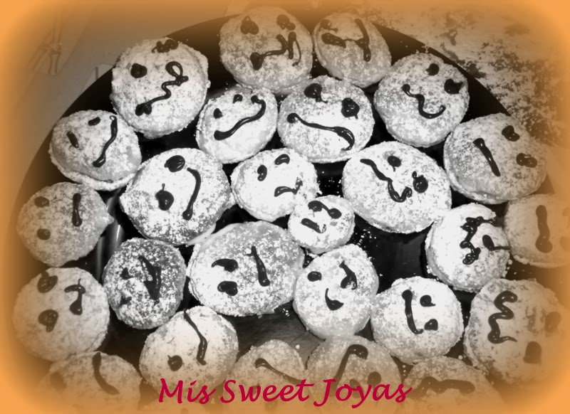 Huevos con arañas, tumbas con sandwich y Miguelitos hallowinianos" border="0" title="Recetas de Halloween --> Huevos con arañas, tumbas con sandwich y Miguelitos hallowinianos" /> Y por último tenemos los típicos "Miguelitos de la Roda" , para ver la receta pincha aquí , pero ésta vez los corté con el cortapastas redondo, para simular caras, por eso Miguelitos Hallowinianos y luego el azúcar glass por encima y por último con chocolate fundido les dibujé los ojos y la boca, para que dieran un poco de miedo.