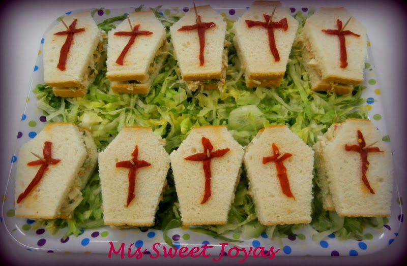 Para prepararlas necesitamos rebanadas de sandwichpimiento rojo asado en lataTomate, aceitunas, mayonesa, lechuga, tomate, atún .... el relleno lo haremos a nuestro gusto. Hacemos primero el relleno, todo troceado y lo mezclamos con la mayonesa. Cortamos las rebanadas en forma de tumba y los rellenamos con la mezcla previamente hecha.Abrimos la lata de pimientos y los cortamos a tiras para hacer las cruces de las tumbas y con un palillo las aguantamos. Fácil y original, verdad?