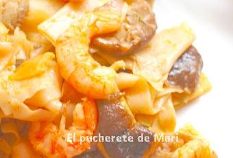 La pasta, pescado, bueno en este caso gambas, setas y bambú. Como el resto de platos que he puesto estos días, no es complicado, es un plato completo, fácil, rápido, sano y económico.