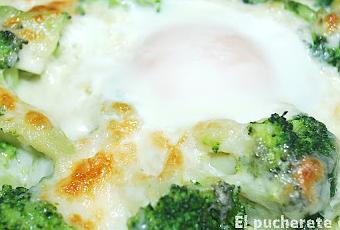 Escurrimos y colocamos el brócoli, ponemos en platos o si preferimos en una fuente para horno, echamos un chorrito de aceite de oliva, hacemos un hueco en el centro de cada plato y colocamos el huevo, salpimentamos, espolvoreamos con el queso rallado. Metemos en el microondas 10 minutos potencia máxima y un par de minutos de grill, hasta que la clara se cuaje pero la yema no quede dura.