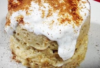 Mezclamos todo bien con ayuda de una batidora y volcamos en una taza. Después, metemos al microondas 1 minuto y medio, con cuidado porque puede rebosar! Por último, lo volcamos en un plato y ponemos los toppings que queramos, yo puse queso batido y canela!